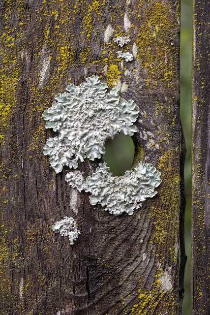 Flavoparmelia and dust lichen on a fence in Oakland