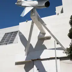 A blue and white jet aircraft is mounted on a white support structure, viewed from below, with a yellow crane visible in the background.