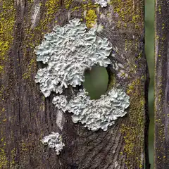 Flavoparmelia and dust lichen on a fence in Oakland