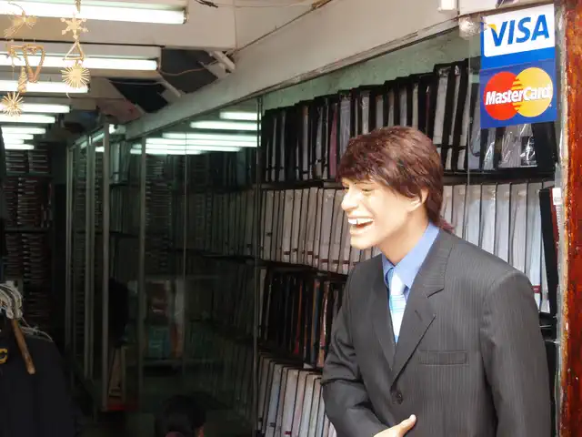 Laughing mannequin in a store on Marqués Street, Cusco, PE