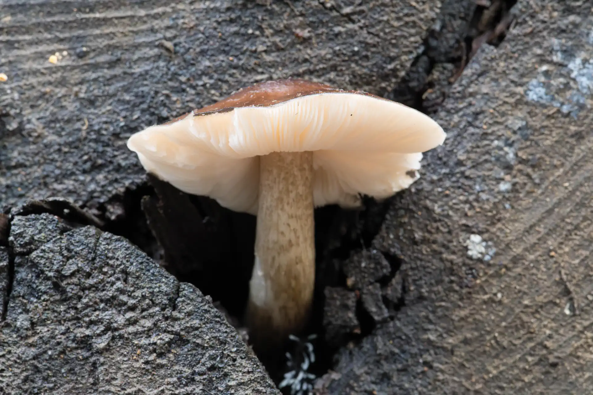 Pluteus exilis mushroom sprouting from a log, Oakland, California, US