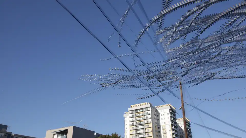 Pigeons landing on a wire, Los Angeles, California, US