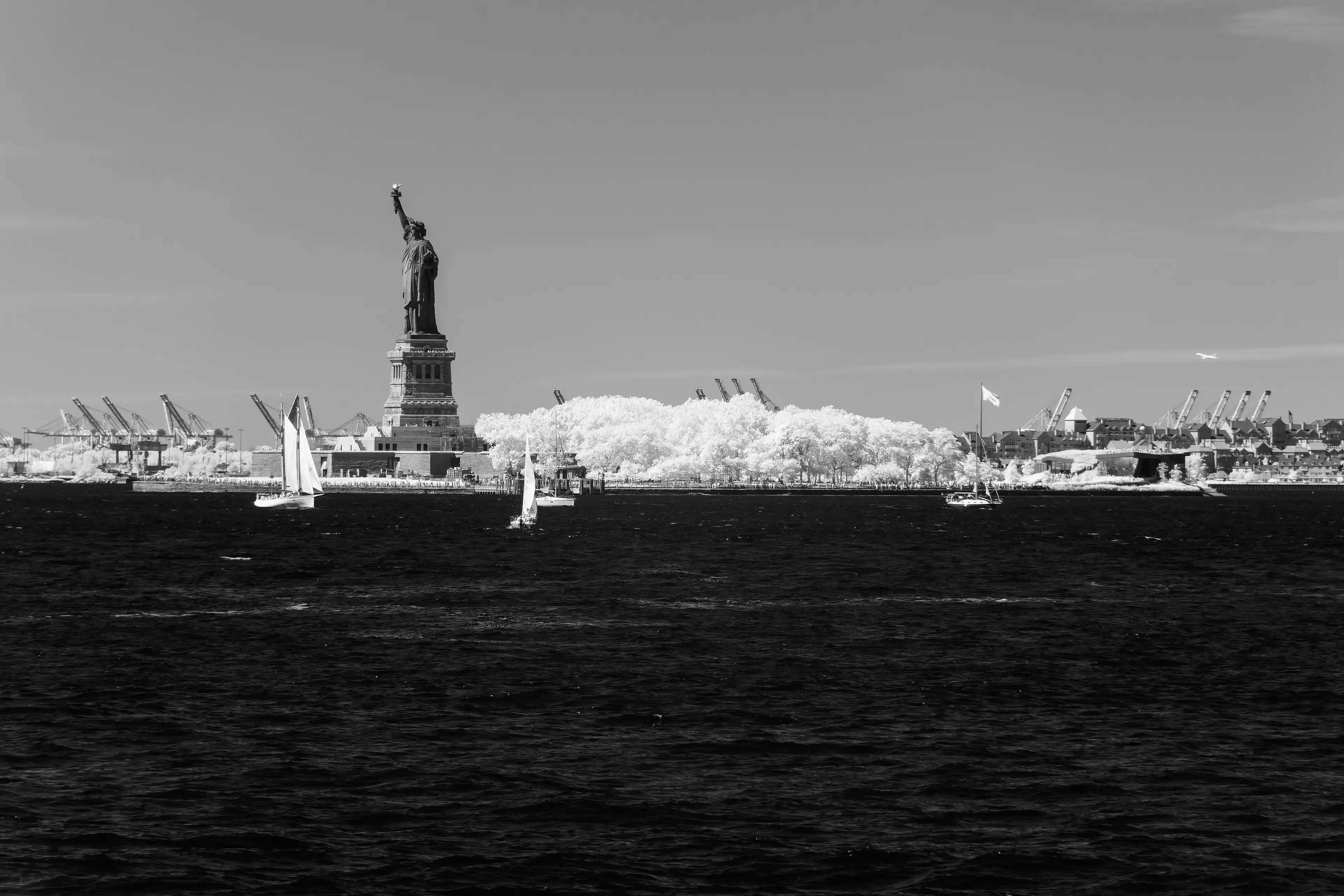 Statue of Liberty with sailboats on the Hudson River